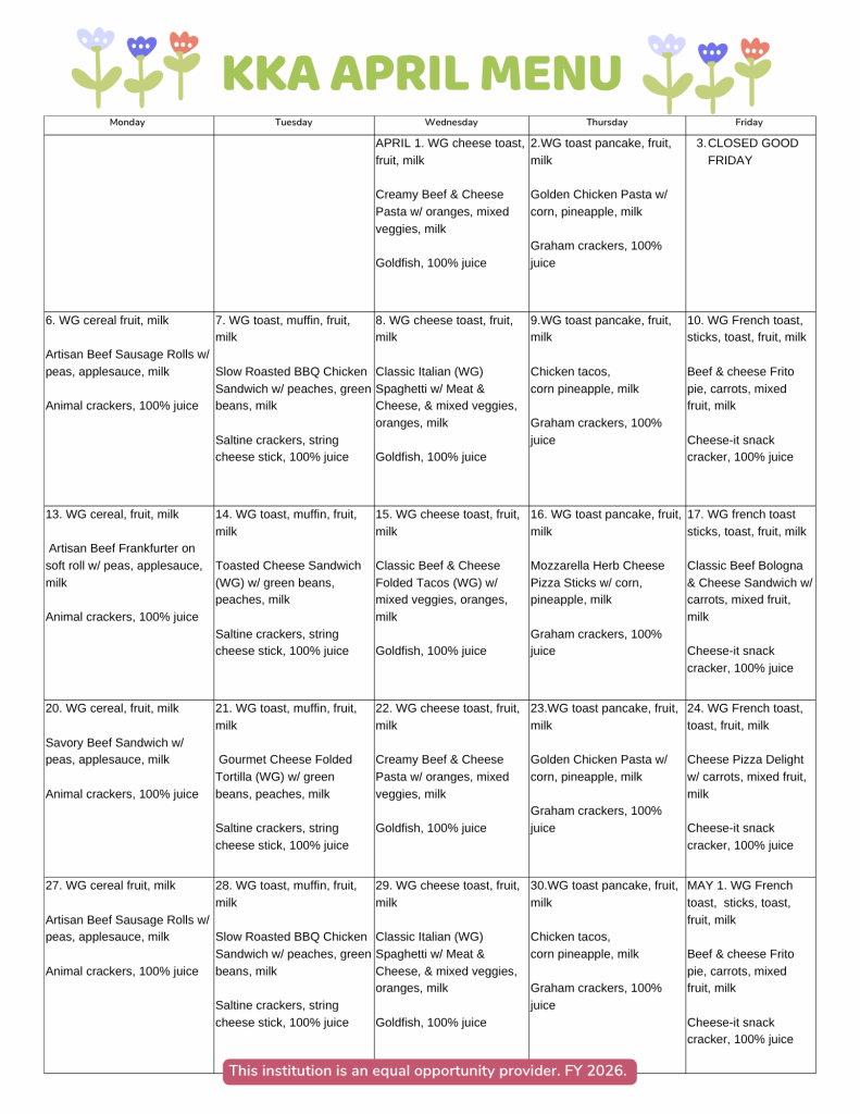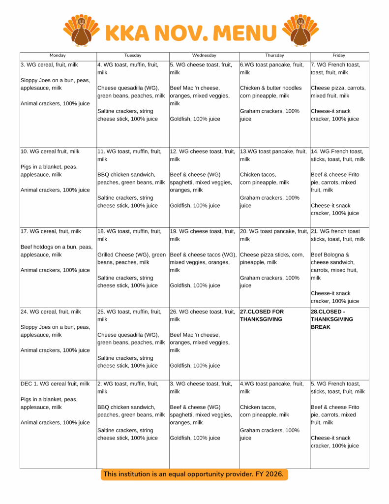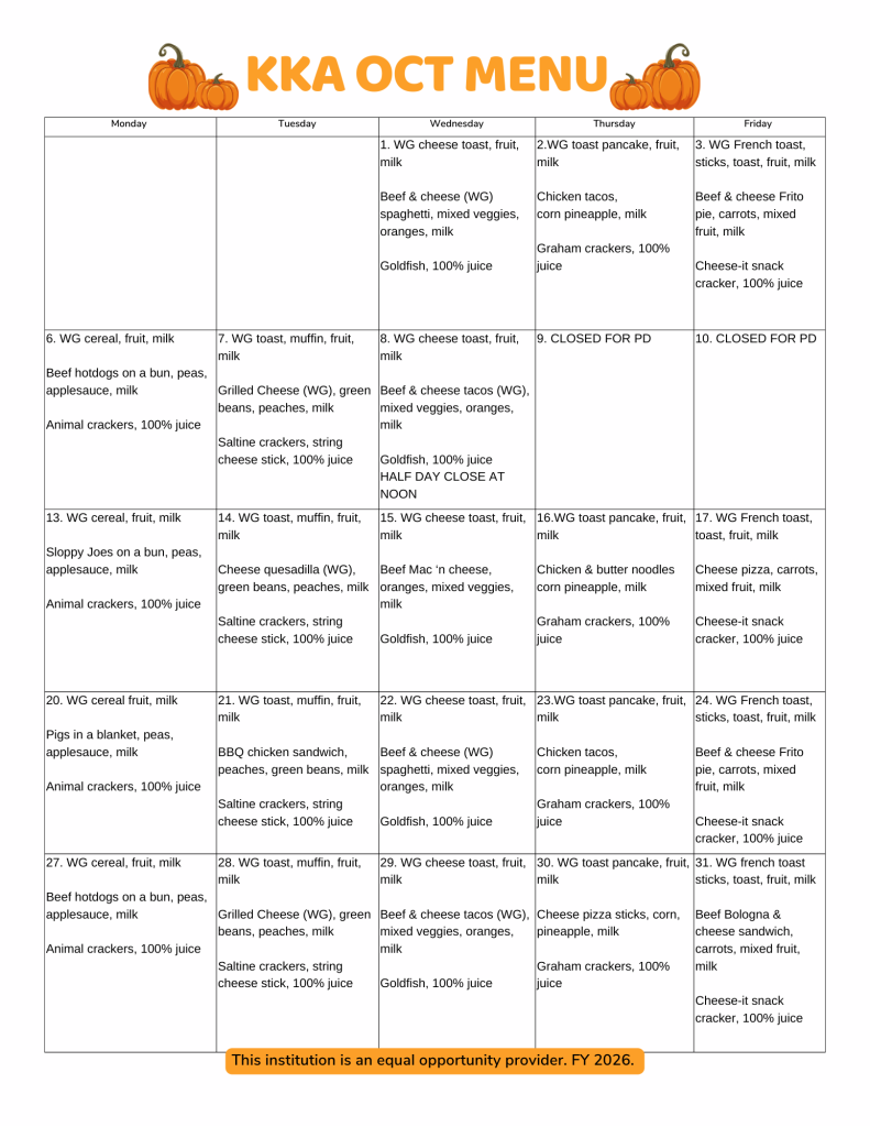 Below you will find an updated calendar for the month, lunch menu, and any other important bulletins.