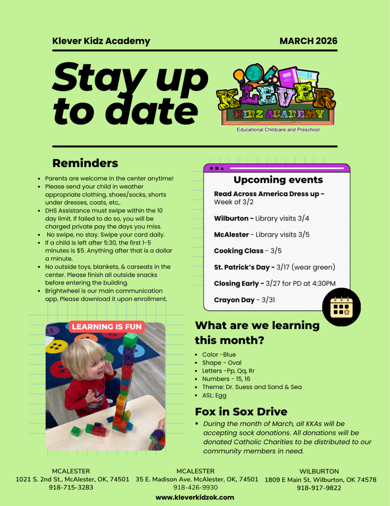 We use the app, Brightwheel, as our main communication between teacher and parent, and as a payment method. Please download the app prior to your child’s first day at Klever Kidz Academy.